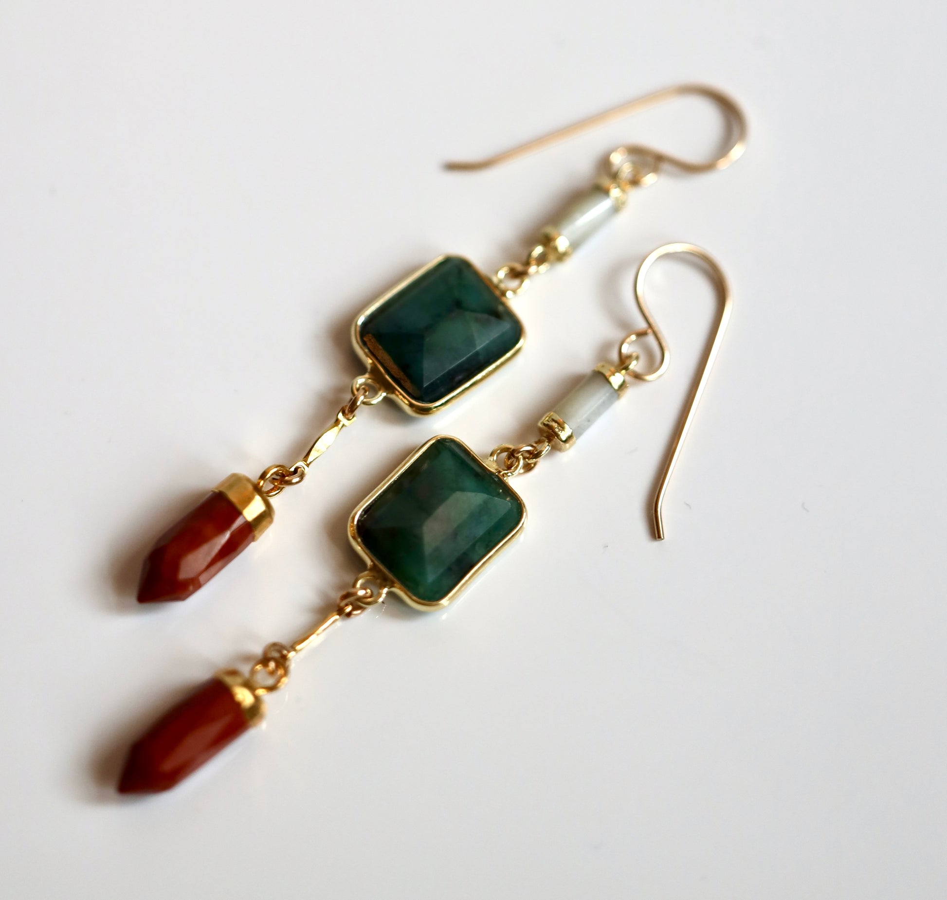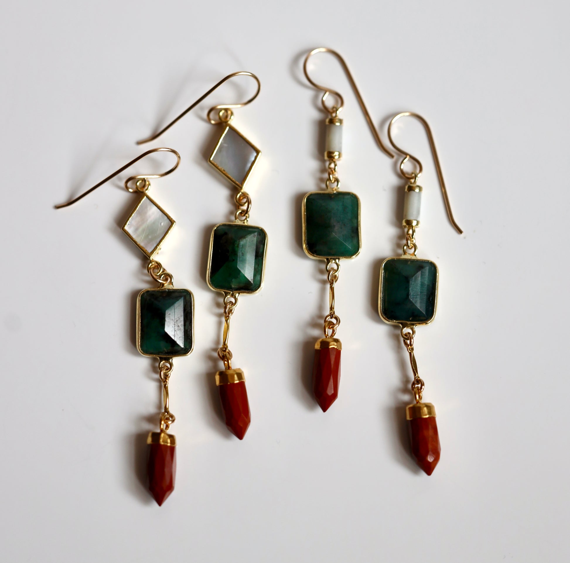 Mother of pearl, emerald, red jasper. All stones are gold plated.