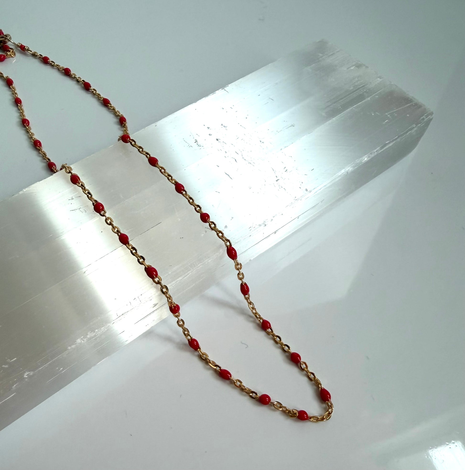 14k gold fill cable chain with fuscia enamel beads. These necklaces make great layering pieces, or are beautiful worn on their own.