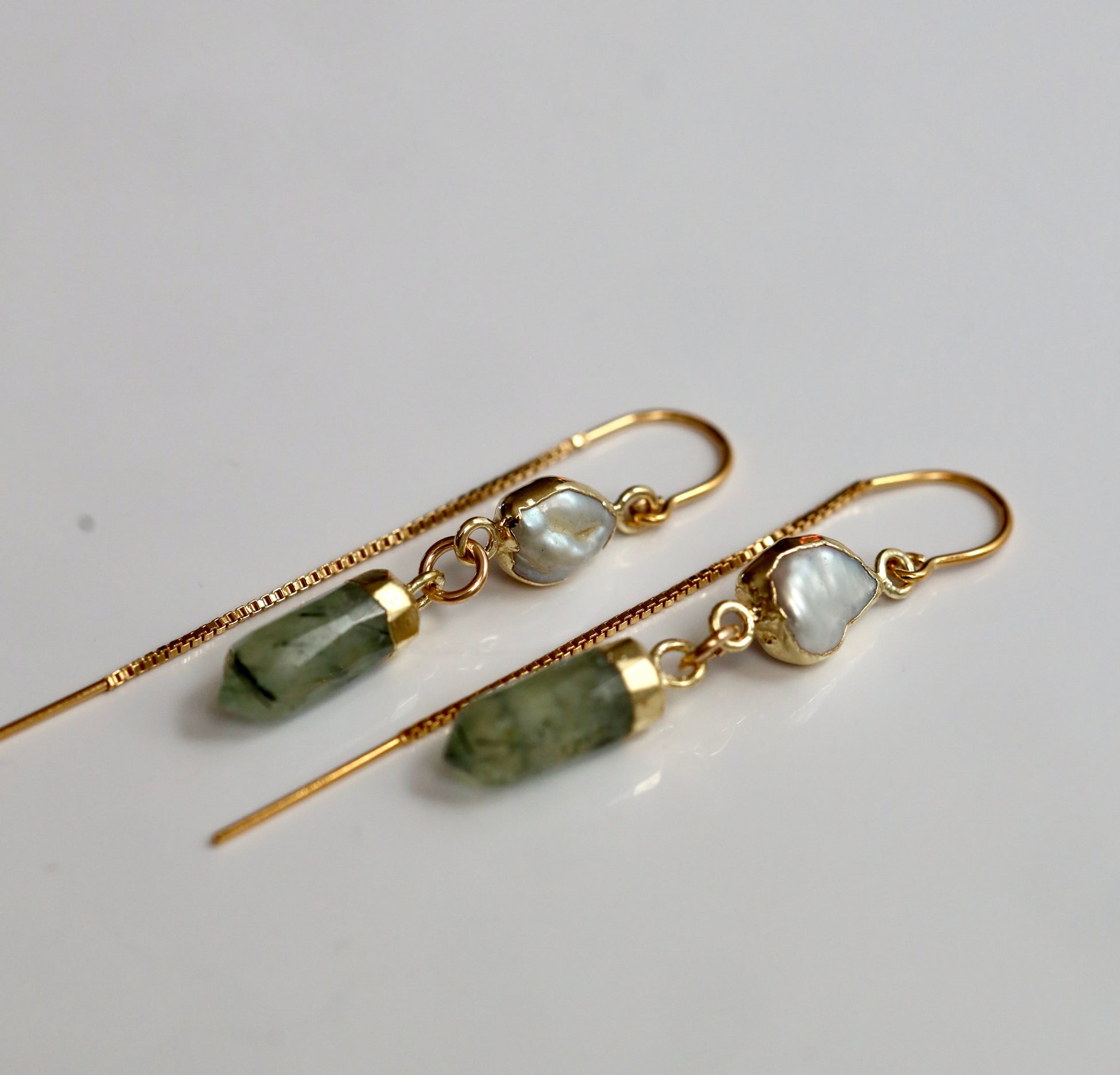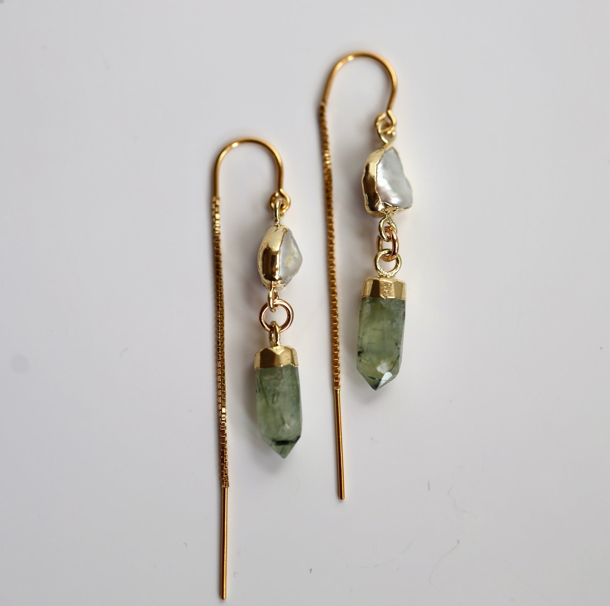 14k gold fill threader earring. Prehnite and pearl are gold plated.