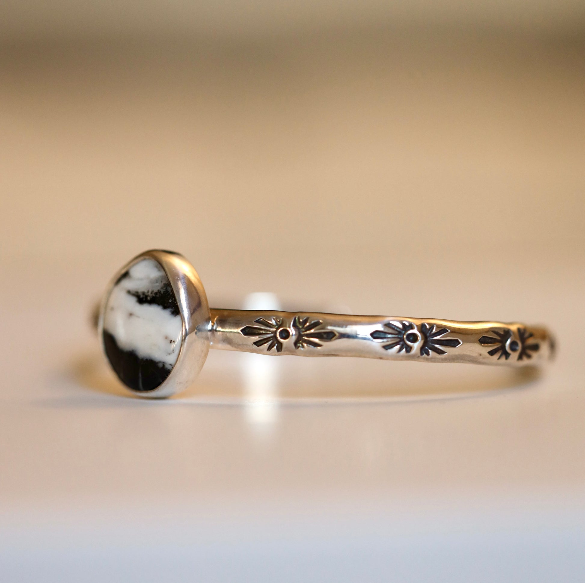 White buffalo set in fine and sterling silver. Single band cuff with oxidized hand stamped details.