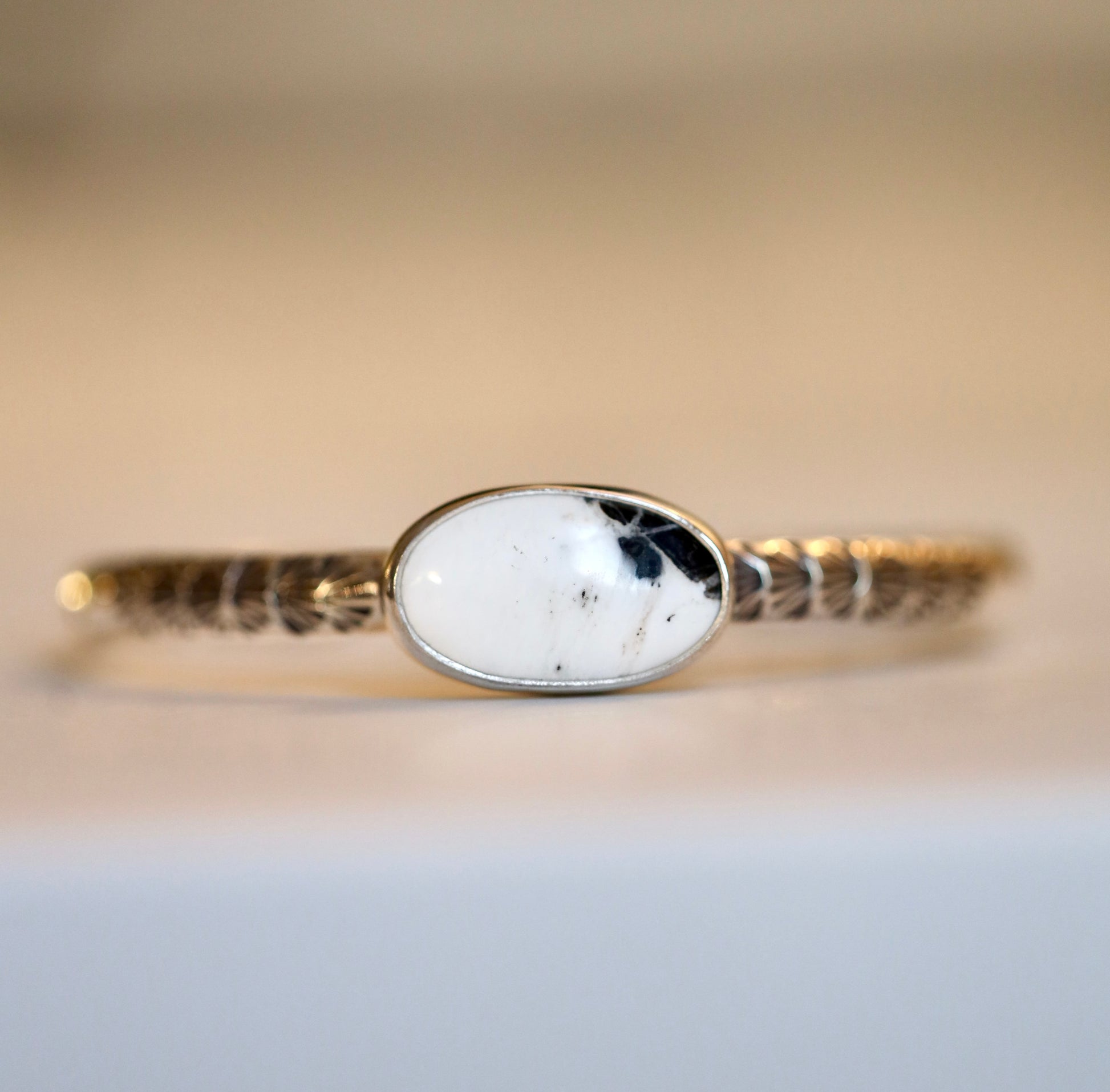 White buffalo set in fine and sterling silver. Single cuff band with oxidized hand stamped embellishments .